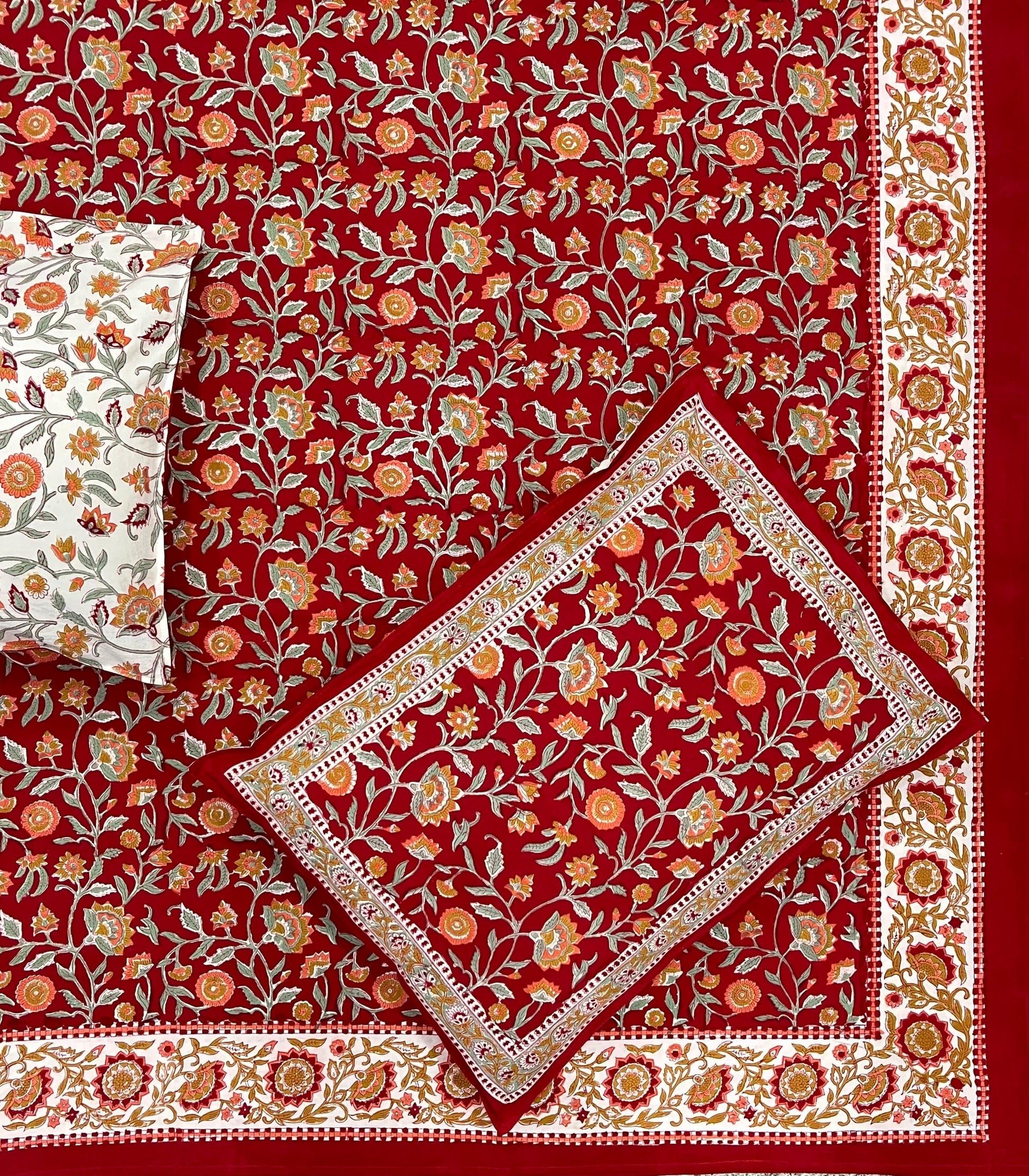 Ruby Bloom Cotton Hand Block Printed Bedsheet and Pillow Case Set
