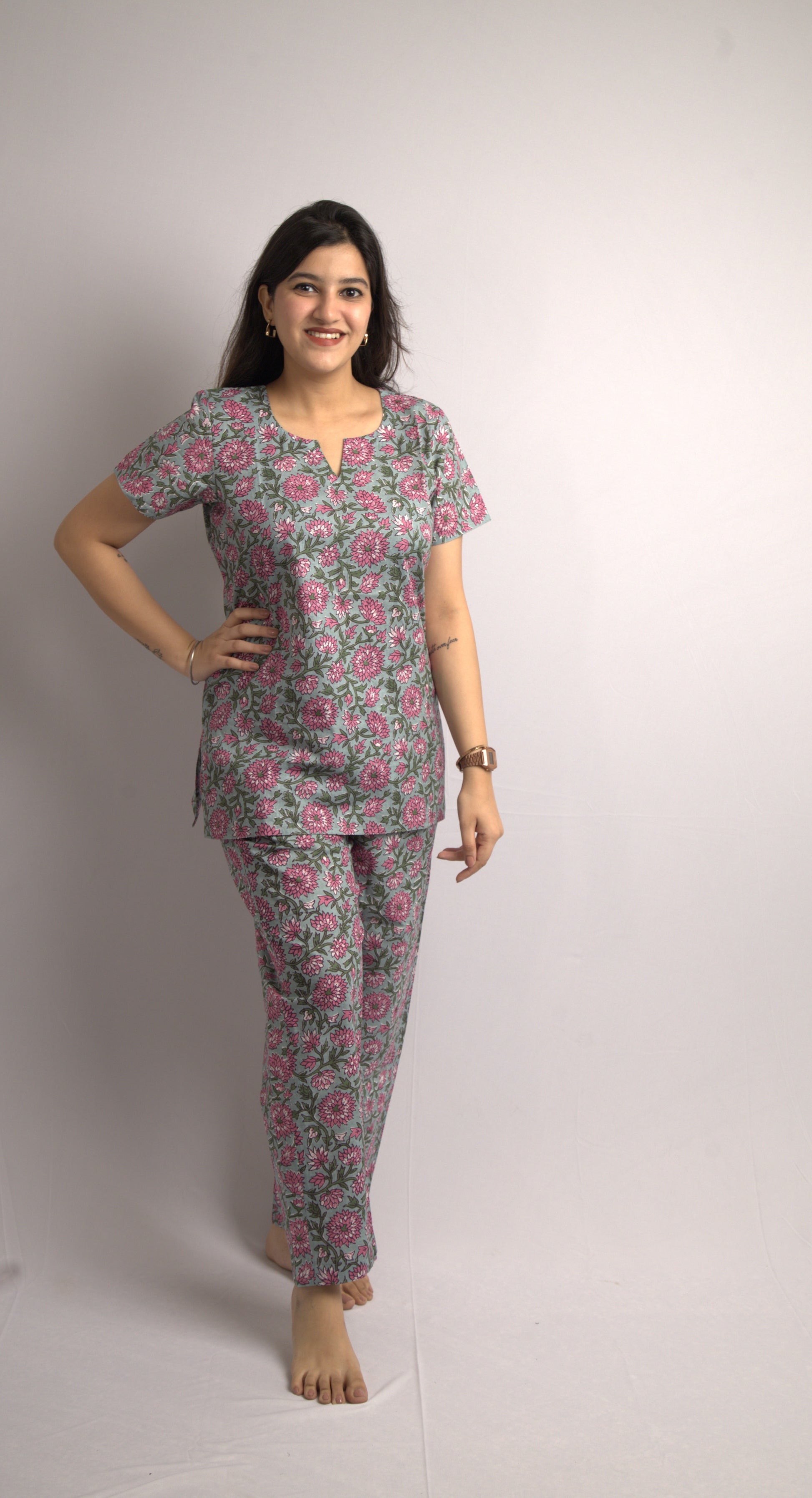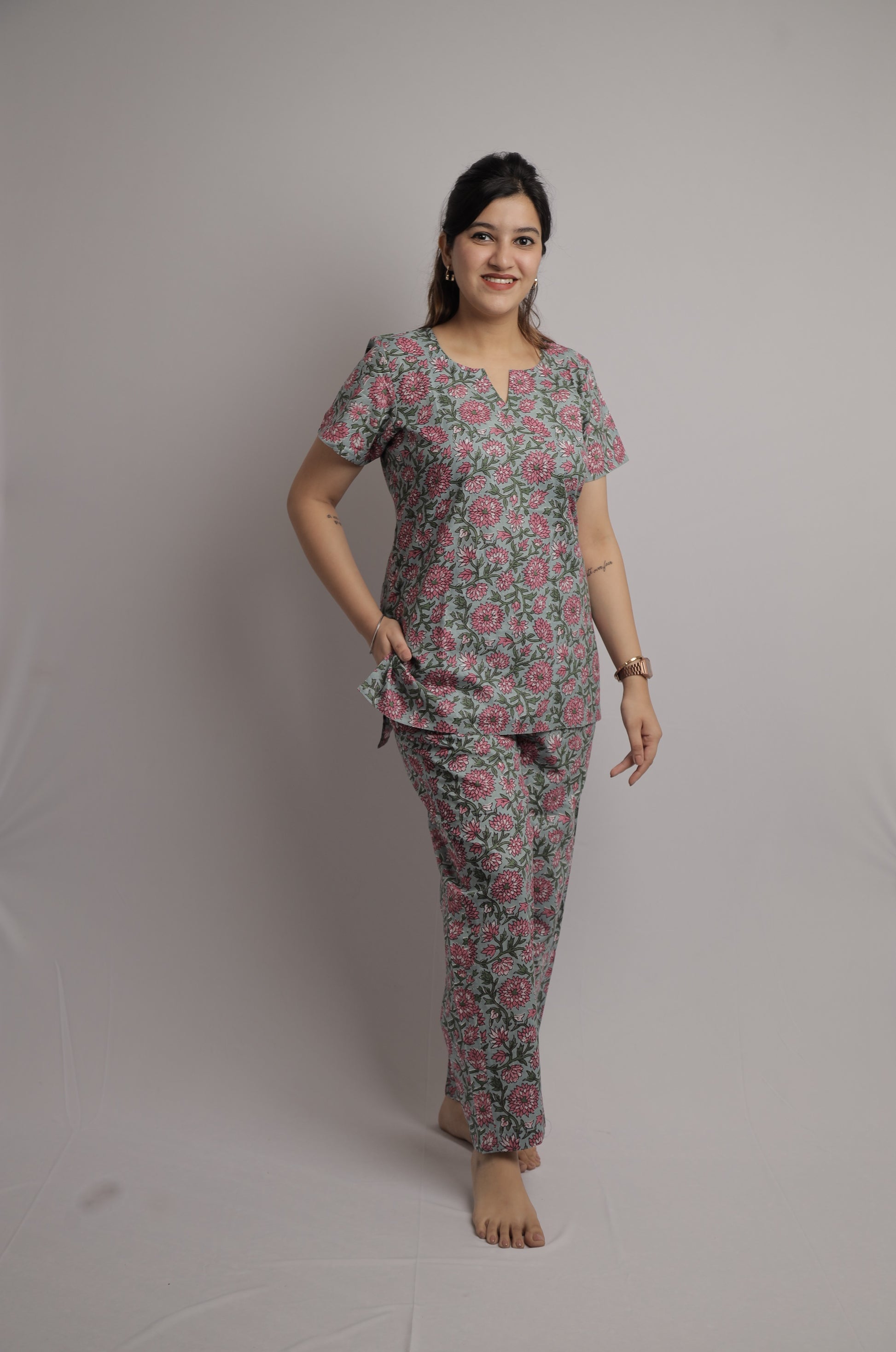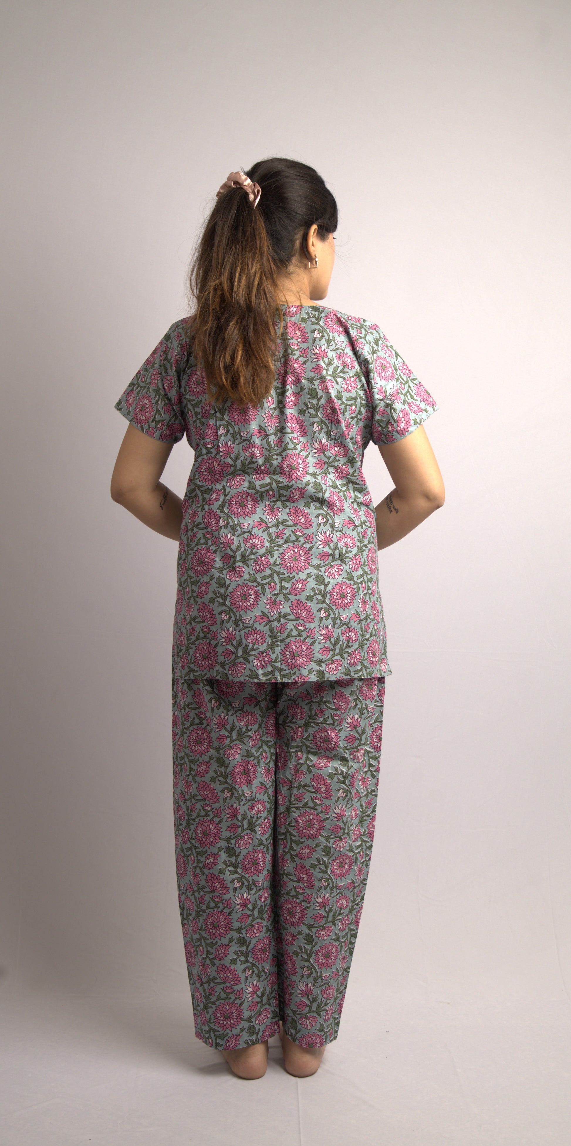 - Color: Muted grey-blue base color, pink shades of Floral