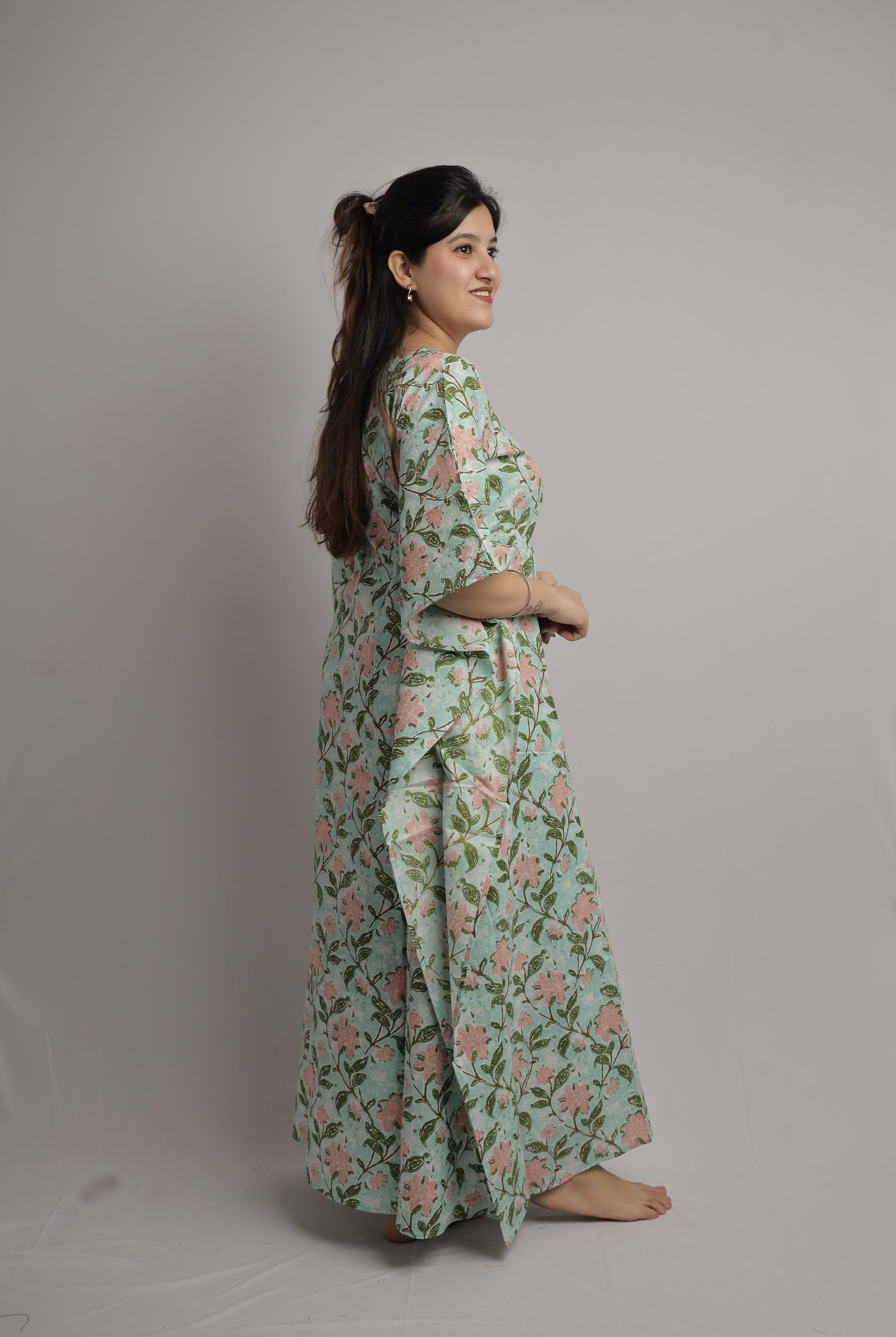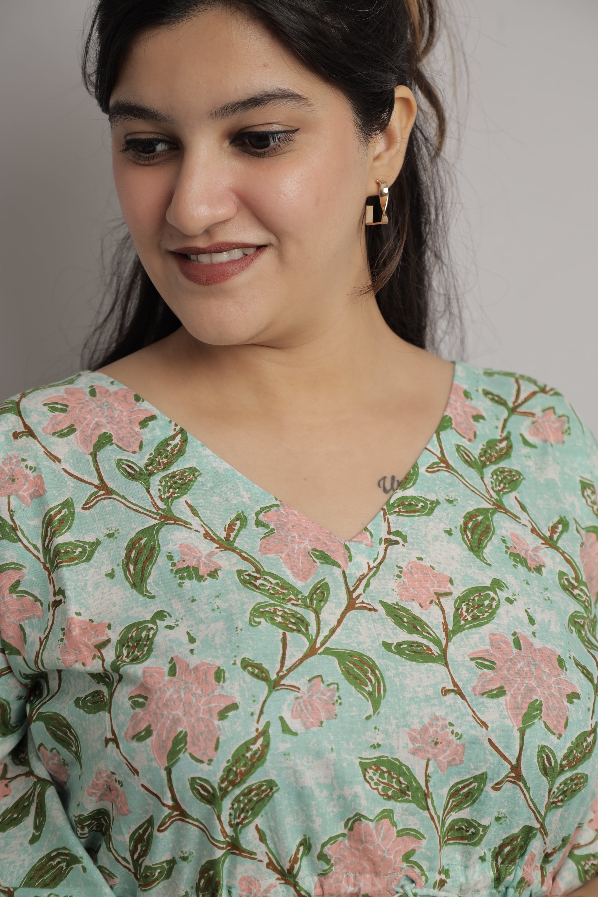 - Print: Hand-block inspired floral print in shades of pink and red with leafy green details