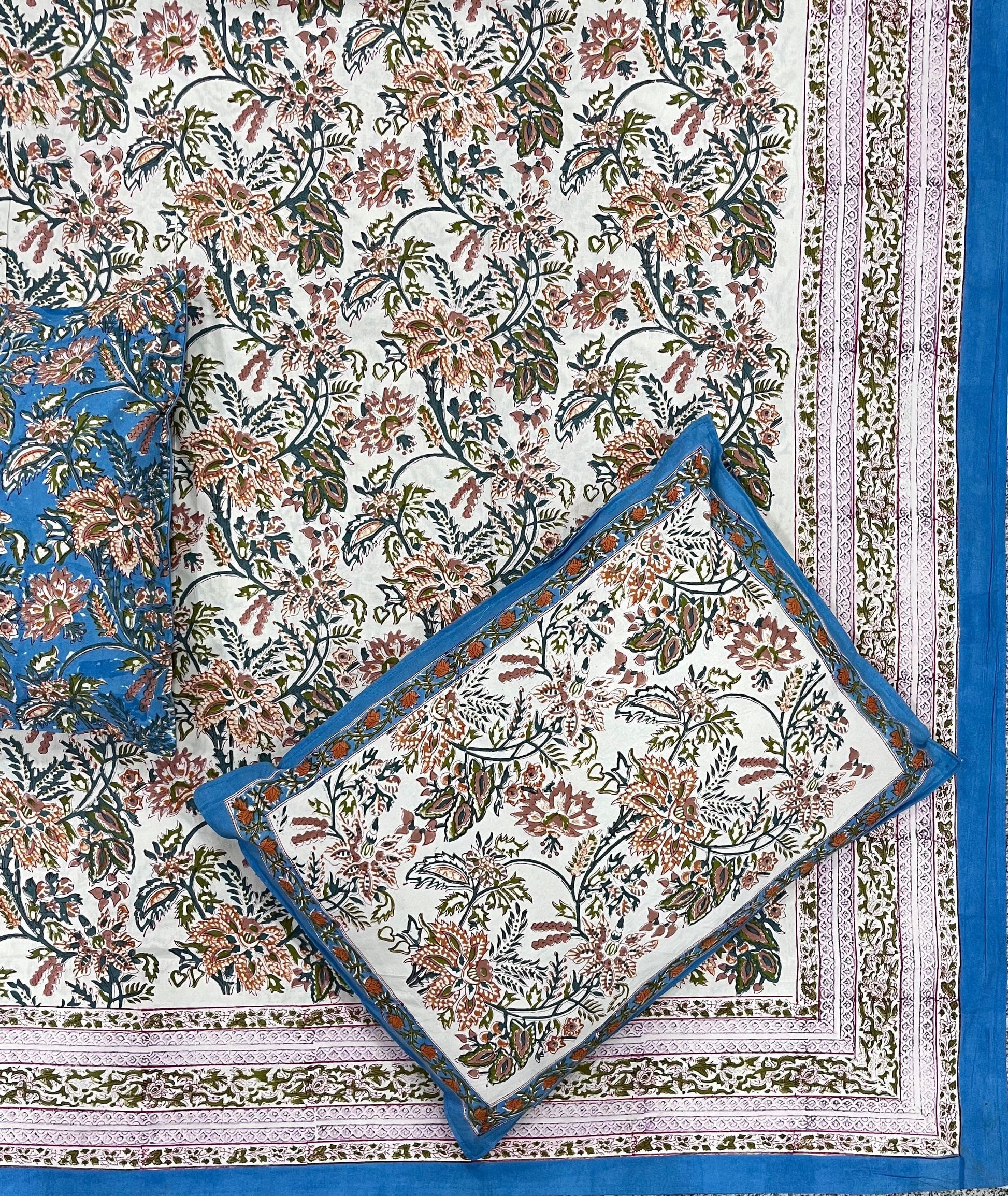 Bluebird Bloom Cotton Hand Block Printed Bedsheet and Pillow Case Set